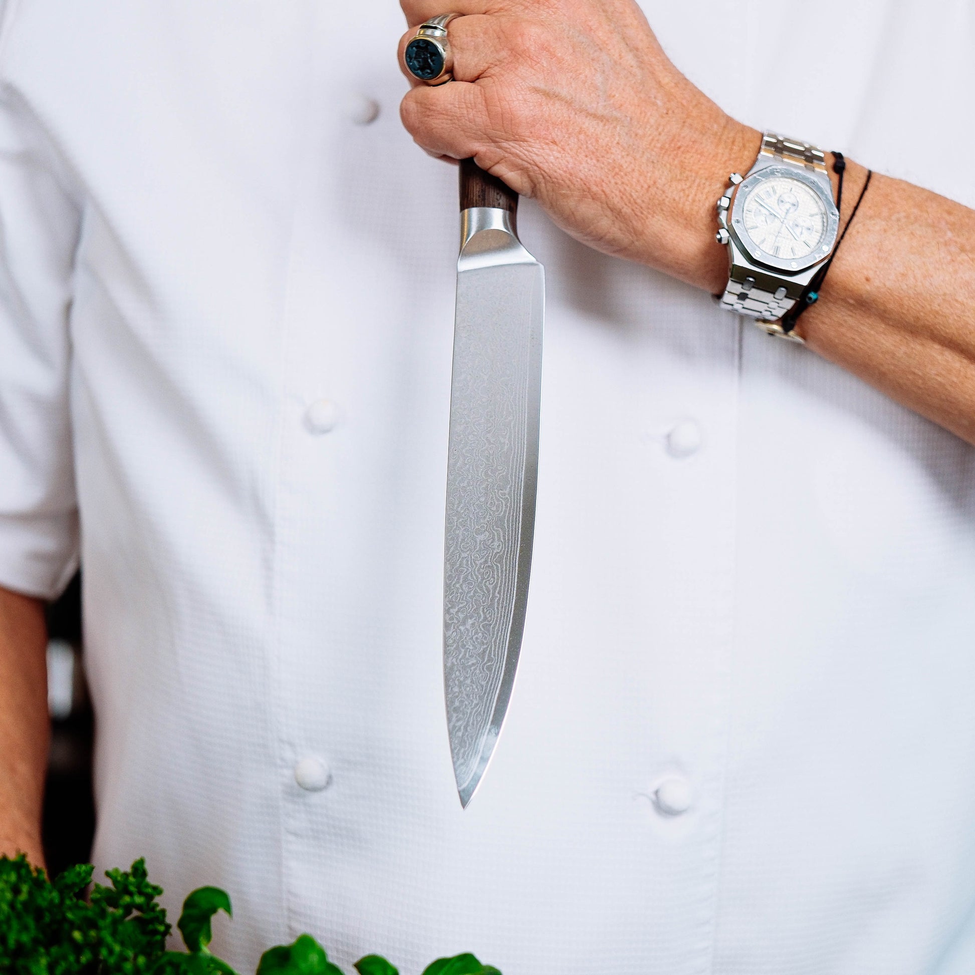 Met het Damascus Trancheermes 20 cm snijd je vlees precies zoals het hoort. Lange, gecontroleerde halen geven mooie, gelijkmatige plakken.